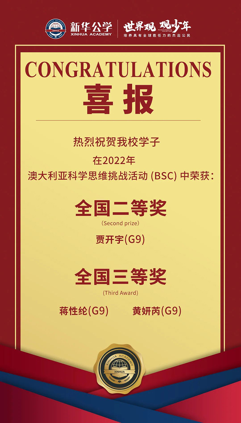 新华公学2022澳大利亚科学思维挑战(BSC)成绩出炉,我校融合部3人获奖。